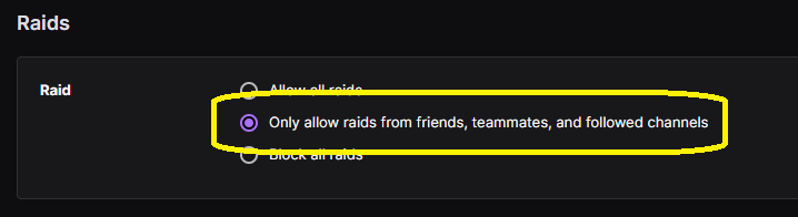 - Select “Only allow raids from friends, teammates, and followed channels”